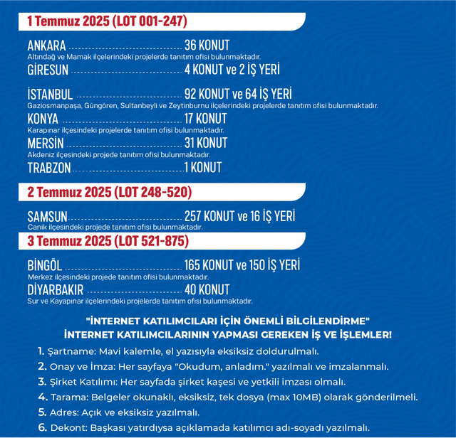 TOKİ, 9 ilde 643 konut ve 232 iş yeri satışı 1-3 Temmuz 2025 tarihlerinde saat 10.30'da gerçekleştirilecek. Satış takvimi şöyle;