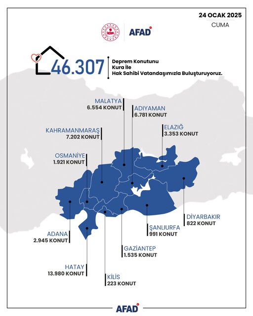 Afet ve Acil Durum Yönetimi Başkanlığı (AFAD), depremden etkilenen 11 ilde yapımı tamamlanan 46 bin 307 konutun ve 149 işyerinin kura ile hak sahiplerine teslim edileceğini duyurdu.