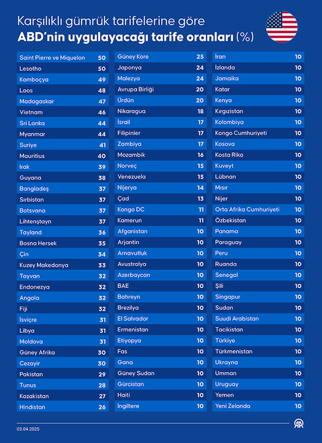 Bu kapsamda tüm ülkelere getirilen yüzde 10 oranındaki temel gümrük vergisinin 5 Nisan'da yürürlüğe gireceği bildirilen açıklamada, ülkelere özel olarak belirlenen daha yüksek oranlı tarifelerin ise 9 Nisan'da yürürlüğe gireceği kaydedildi.