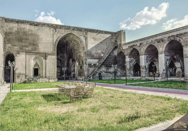 Giriş eyvanıyla dahil olunan avlu, kuzey-güney yönünde uzanan dikdörtgen planlı geniş bir alan. Doğu ve batı kanatları kapalı ve yarı-açık mekânlarla çevrili. Hanın kapalı/barınak bölümünün taçkapısındaki dört satırlık sülüs hatlı Arapça kitâbeden, yapının Selçuklu Sultanı I. Alâeddîn Keykubad zamanında tamamlandığı anlaşılıyor.