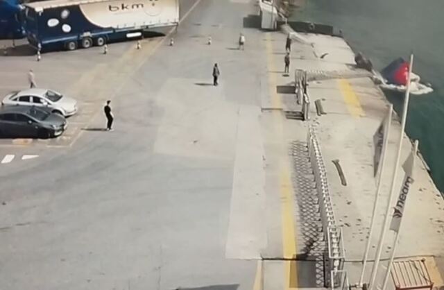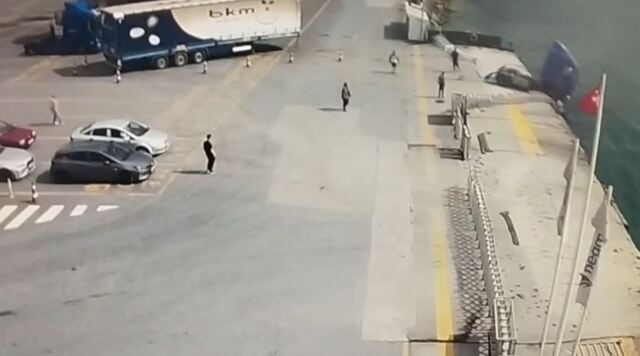İş yerinin güvenlik kameralarınca kaydedilen görüntülerde, TIR'ın dorsesinden ayrılarak hareket etmesi, bir kişinin aracı durdurabilmek için sol arka lastik davlumbazından tutması ve aracın denize düşmesi yer alıyor.
