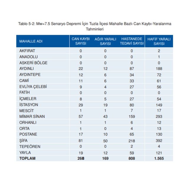 *7.5 Senaryo Depremi İçin Tuzla İlçesi Mahalle Bazlı Can Kaybı-Yaralanma Tahminleri