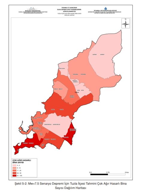 *Mw=7.5 Senaryo Depremi İçin Tuzla İlçesi Tahmini Çok Ağır Hasarlı Bina Sayısı Dağılım Haritası