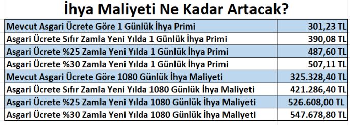 Asgari ücrete yüzde 25 zam geldiğinde 1 günlük ihya primi 487,60 TL’ye, yüzde 30 zam geldiğinde ise 1 günlük ihya primi 507,11 TL’ye çıkacak. Bu durumda ise asgari ücrete yüzde 25 zam geldiğinde ihya maliyeti yüzde 61,87, asgari ücrete yüzde 30 zam geldiğinde ise ihya maliyeti yüzde 68,35 oranında artacak.