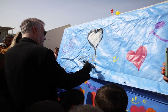 Resmin altına 'FSM-1453' notunu da düşen ünlü isimler, çadır kentteki çocuklarla birlikte günün anısına hatıra fotoğrafı da çektirdi.
