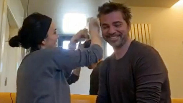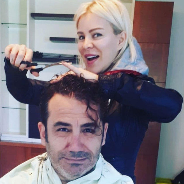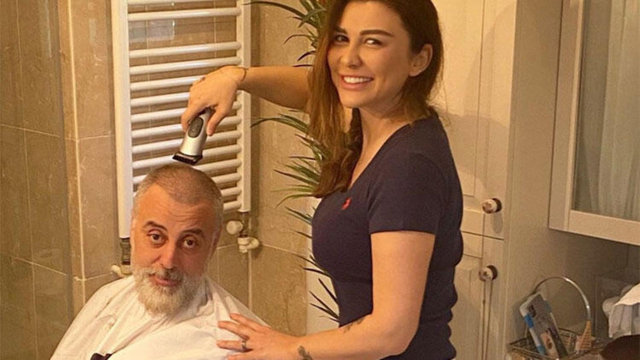 Oyuncu Engin Altan Düzyatan'ın saçları uzayınca Neslişah Alkoçlar eşinin saçını kesti.