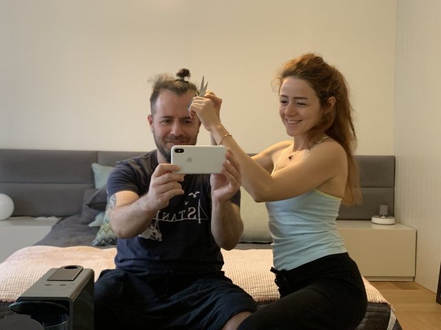 Koronavirüsten korunmak adına uzun süredir evden çıkamadığı için berbere gidemeyen Emre Aydın da, saçlarını eşi Eda Köksal Aydın'a emanet etti.