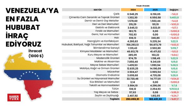 Türkiye ile dış ticareti 2025'te ise daha aralık ayı verileri belli değilken yani 11 ayda 403 milyon dolar civarında. Bu ülke ile dış ticaretimizde rekor yıl yaklaşık 901 milyon dolarlık altın ihraç ettiğimiz 2018 yılında gerçekleşti. Bu ülkeden döküntü ve hurda ile alüminyum, tütün ve kömür ithal ederken makarna buğday unu, yağ, havlu ve bebek bezi satıyoruz. Rakamlar Venezuela'da ne yaşanırsa yaşansın dış ticaretimizin önemli oranda etkilenmeyeceğini ortaya koyuyor.
