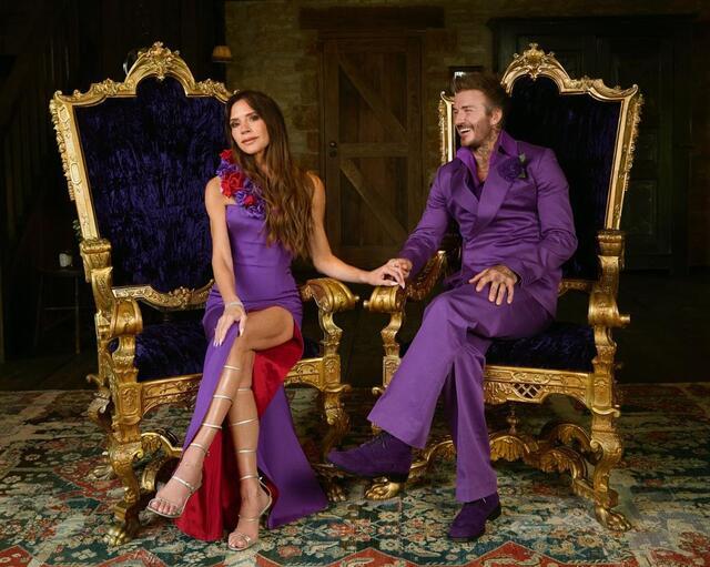 4 Temmuz 1999'da evlenen çift, mor renkli sıra dışı düğün kıyafetlerini yıllar sonra yeniden giyerek kutlama yapmıştı. David Beckham, düğünlerinde kullandıkları taht tarzı koltuklara oturdukları fotoğrafı sosyal medyada, "Bakın ne bulduk" notuyla paylaşmıştı.