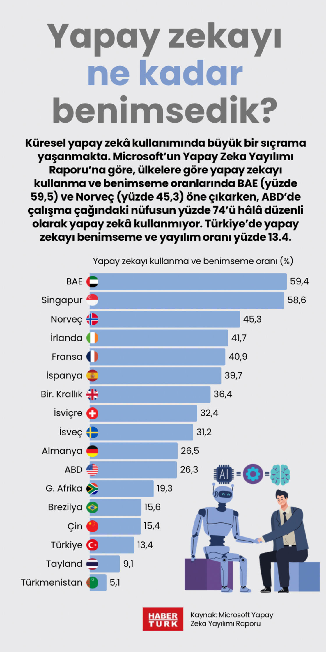 Küresel yapay zeka kullanımında büyük bir sıçrama yaşanmakta. Microsoft'un Yapay Zeka Yayılımı Raporu'na göre, ülkelere göre yapay zekayı kullanma ve benimseme oranlarında BAE (yüzde 59,5) ve Norveç (yüzde 45,3) öne çıkarken, ABD'de çalışma çağındaki nüfusun yüzde 74'ü hâlâ düzenli olarak yapay zekâ kullanmıyor. Türkiye'de yapay zekayı benimseme ve yayılım oranı yüzde 13.4.
