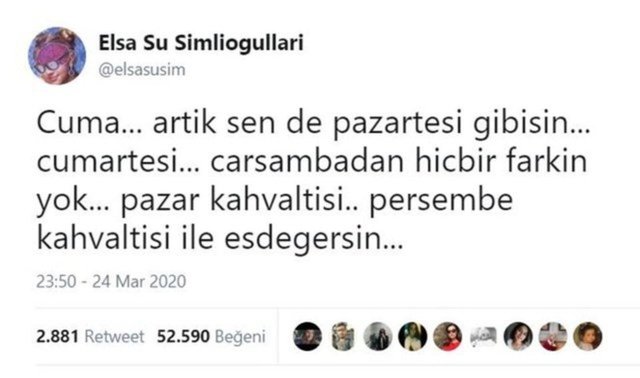 İçinde bulunduğu durumlara eğlenceli şekilde isyan edenlerin sıkça yer aldığı sosyal paylaşım sitesi Twitter'dan yapılan tespitler, sosyal medya kullanıcılarına kahkaha attırıyor. Biz de yakın zamanda paylaşılan en komik tweetleri bir araya getirdik! İşte sosyal medyada güldüren komik paylaşımlar...