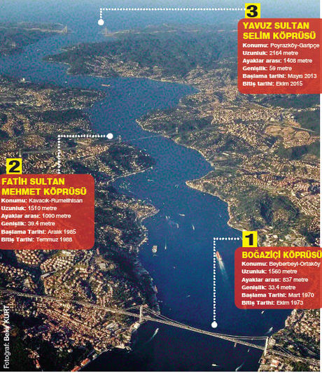 Uçaktan çekilen bu fotoğraf, İstanbul Boğazı’nın ikisi tamamlanmış, biri de açılış için gün sayan 3 gerdanlığını bütün güzelliğiyle ortaya çıkardı. Boğaz’ın Tarihi Yarımada üzerinden çekilen fotoğrafında, Boğaziçi Köprüsü, Fatih Sultan Mehmet Köprüsü ve henüz tabliyeleri yerleştirilmekte olan Yavuz Sultan Selim Köprüsü bir gerdanlık gibi öne çıkıyor. 6 bin metre mesafeden çekilen fotoğrafta, 20 kilometrelik İstanbul Boğazı’nın kıvrımları, tarihi yapıları, deniz trafiği, yeşil alanları tüm görkemiyle görülüyor. Özellikle Anadolu yakasındaki yeşil alanlar dikkat çekerken, sahillerdeki yapılaşma da göze çarpan unsurlardan biri...
