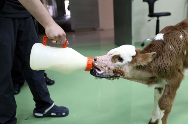 Daha sonra buzağıyı ameliyata aldık. Çene kemiklerini parçaladık, ardından tek çene haline getirdik. Üç dilini birleştirerek tek dil yaptık. Şimdi biberonla besliyoruz. Bir hafta sonra taburcu edeceğiz. Gittiğinde annesini rahatlıkla emebilecek, ayrıca kendi beslenmesini de sağlayabilecek.''
