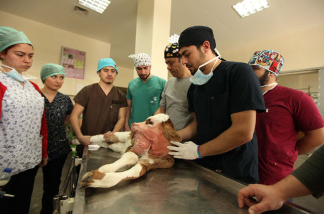 Fakat ameliyattan sonra kendi başına beslenebilecek. Ameliyatı, alanında uzman iki veteriner hekim ve asistan arkadaşımla gerçekleştireceğiz.'' dedi.Buzağının sahibi Şahin Sevinç ise ilk defa böyle bir durumla karşılaştığını dile getirdi. Doğumun ardından buzağıyı kontrol edince çok şaşırdığını anlatan Sevinç, "Annesini ememeyen buzağının durumuna üzüldüğüm için hayvan hastanesine getirdim. İnşallah tedavisi başarılı olur.'' diye konuştu.