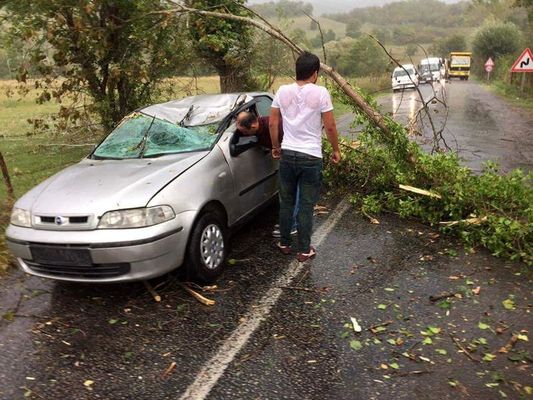Bartın'da etkili olan yağmur ve fırtına nedeniyle seyir halindeki aracın üstene ağaç devrildi. Araç içerisinde bulunan 2 kişi ise yaralandı.