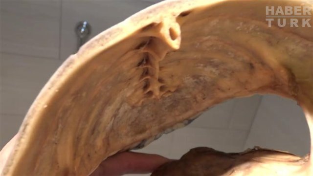 Kabuğun iç kısmını inceleyen baba oğul, kabuğun içinin sert kemiksi bir yapıda olduğunu belirtti.