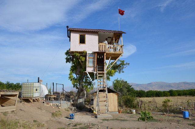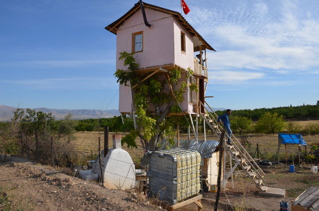Bahçede daha önce çıkan bir yangında zarar gören ceviz ağacının 5,5 metre yükseğine iki katlı bağ evi inşa eden Seheryıldızı, beslediği hayvanlarını bırakmamak için elektrik ve suyu olmayan evde 2 yıldır yaşamını sürdürüyor.