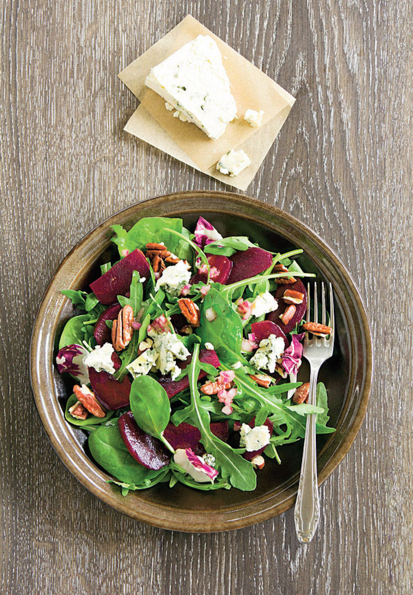Kırmızı pancarları soyup bir tencerede haşlayın. Diğer yanda 5 dakikayı geçmemek şartıyla brokolileri kaynatın. Yeşillikleri ve rokayı iri şekilde doğrayın. Haşlanmış pancarları da büyük büyük doğrayın. Ekşi elmayı kabuğunu soymadan dilimleyin. Brokolileri ve pancarı biraz soğuduktan sonra rokalı karışıma ekleyin, üzerine elma dilimlerini serpiştirin. Daha sonra salatanızın üzerine peynir ve ceviz parçalarını serpiştirin. Damak zevkinize göre nar ekşisi, tuz ve zeytinyağı ekleyin.