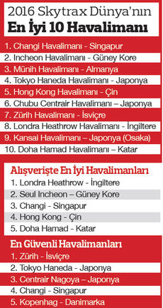 TAV’ın işlettiği Atatürk Havalimanı’nda yer alan Türk Hava Yolları (THY) özel yolcu salonunun (CIP Lounge) geçen yıl, Skytrax tarafından dünyanın en iyisi seçildiğinin altını çizerek ve bir gün Türkiye’den havalimanlarının da ilk 10’da yer alacağını ümit ederek, 2016’nın en iyi havalimanlarına göz atalım.