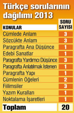 Türkçe Zümre Başkanı Osman Gök ise Türkçe sınavında en çok sözcükte ve cümlede anlam ile paragraf gibi okuduğunu anlama ve yorumlama ile ilgili soruların çıktığını söyleyerek, öğrencilere bu yıl da aynı konulardan sorulara hazırlıklı olmaları gerektiği uyarısında bulunuyor.