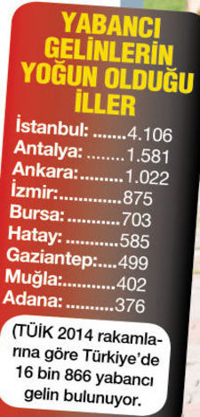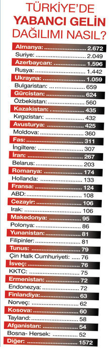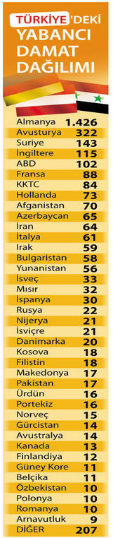 İnsanlar, aşkları için dünyanın bir ucundan kalkıp diğer ucuna gidip yeni hayatlar kurdu. Türkiye İstatistik Kurumu (TÜİK) verilerine göre 2014 yılında Türkiye’de 596 bin 704 çift hayatını birleştirdi. Bu evliliklerle 3 bin 403 yabancı damat, 16 bin 866 da yabancı gelinimiz oldu. Geçtiğimiz yıl kızlarımız da erkeklerimiz de farklı ülkelerden yaptıkları evliliklerde en fazla Almanları tercih etti ve aynı yıl 1426 Alman damat, 2 bin 672 de Alman gelin geldi. Savaşın da etkisiyle yabancı gelinlerde ikinci sırayı Suriyeliler aldı. 2 bin 49 Suriyeli bir Türk ile hayatını birleştirdi. Kızlarımız ise ikinci sırada en çok Avusturyalı erkekle evlendi; 322 Avusturyalı damadımız oldu.