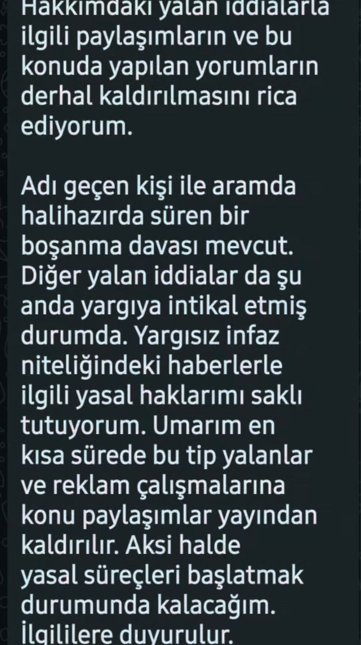 Yıldız Asyalı'nın bu paylaşımının ardından eşi Mustafa Semih Demirci, açıklamada bulundu. Demirci, yaptığı açıklamada şu ifadelere yer verdi; "Hakkımdaki yalan iddialarla ilgili paylaşımların ve bu konuda yapılan yorumların derhal kaldırılmasını rica ediyorum. Adı geçen kişiyle aramda halihazırda süren bir boşanma davası mevcut. Diğer yalan iddialar da şu anda yargıya intikal etmiş durumda. Yargısız infaz niteliğindeki haberlerle ilgili yasal haklarımı saklı tutuyorum. Umarım en kısa sürede bu tip yalanlar ve reklam çalışmalarına konu paylaşımlar yayından kaldırılır. Aksi halde yasal süreçleri başlatmak durumunda kalacağım. İlgililere duyurulur."
