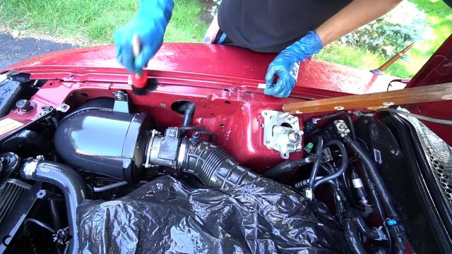 Sabunlu sudan oluşan spreyi motora zarar vermeden yüzeye sıktı ve fırçayla yüzeyi ovaladı.