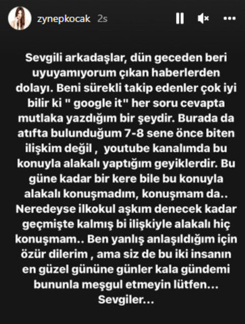 Zeynep Koçak, 23.08.2022 tarihinde hakkında çıkan haberlerin ardından özür dileyerek, Instagram hesabından konuyla alakalı şu açıklamayı yaptı:Sevgili arkadaşlar... Dün geceden beri uyuyamıyorum çıkan haberlerden dolayı. Beni sürekli takip edenler çok iyi bilir ki 'google it' her soru-cevapta mutlaka yazdığım bir şeydir. Burada da atıfta bulunduğum 7-8 sene önce biten ilişkim değil, YouTube kanalımda bu konuyla alakalı yaptığım geyiklerdir. Bugüne kadar bir kere bile bu konuyla alakalı konuşmadım, konuşmam da... Neredeyse ilkokul aşkım denecek kadar geçmişte kalmış bir ilişkiyle alakalı hiç konuşmam. Ben yanlış anlaşıldığım için özür dilerim ama siz de bu iki insanın en güzel gününe günler kala gündemi bununla meşgul etmeyin lütfen. Sevgiler...