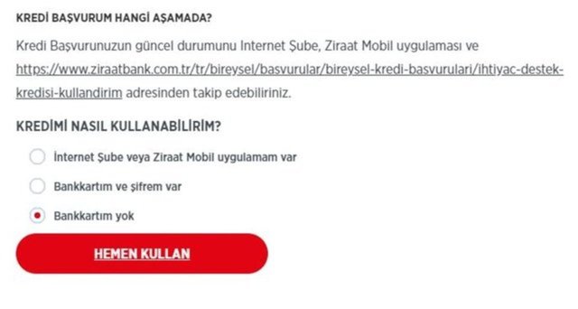Eğer bunların hiç biri yok ise https://www.ziraatbank.com.tr/tr/bireysel/basvurular/bireysel-kredi-basvurulari/ihtiyac-destek-kredisi-kullandirim bu adres üzerinden sorgulama yapabilirsiniz. Buraya tıkladığınızda karşınıza şu şekilde bir ekran çıkacaktır.